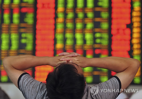 | △ 이럴 수가… (푸양<中안후이성> AP=연합뉴스) 8일(현지시각) 중국 중부 안후이 성 푸양의 증권사에서 한 주식 투자자가 주식 전광판 앞에서 두 눈을 가린 채 탄식하고 있다. ciy@yna.co.kr A stock investor covers his eyes at a brokerage house in Fuyang in central China's Anhui province Wednesday, July 8, 2015. China announced a flurry of new moves Wednesday to halt a stock market slide. The government told state companies and executives to buy shares, raised the amount of equities insurance companies can hold and promised more credit to finance trading. (Chinatopix via AP) CHINA OUT |