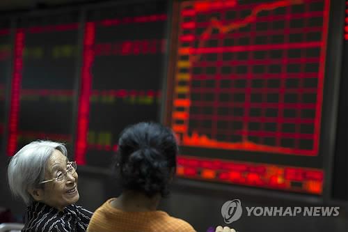 | △ 사진은 9일 베이징의 한 증권사에서 투자자들이 급등세를 보이는 시세 전광판을 보며 웃고 있는 모습.(AP=연합뉴스) |