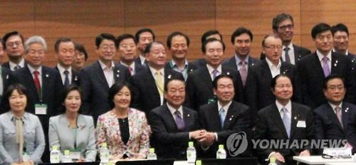 | △ 한일의원연맹과 일한의원연맹 소속 의원이 2015년 7월 10일 일본 도쿄도 중의원 제1의원회관에서 합동총회를 마치고 사진 촬영에 응하고 있다. 한일의원연맹 회장인 새누리당 서청원(앞줄 왼쪽 네 번째) 의원과 일한의원연맹 회장인 자민당 누카가 후쿠시로(額賀福志郞, 앞줄 왼족 다섯 번째)의원이 손을 잡고 있다. |