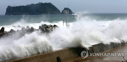 | △ (서귀포=연합뉴스) 변지철 기자 = 10일 오후 제주 해상이 북상하는 제9호 태풍 찬홈의 간접 영향권에 접어든 가운데 서귀포시 법환포구에 높은 파도가 일고 있다 2015.7.10 bjc@yna.co.kr |