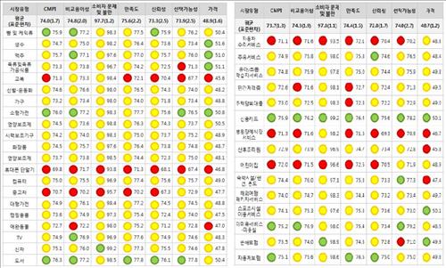 휴대전화 다음으로 CMPI가 낮아 빨간 신호등 경고를 받은 받은 부문은 중고차( 70.7점)와 교복(71.3점)이다.
