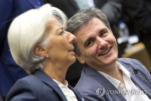 | △ (브뤼셀 AP=연합뉴스) 12일(현지시간) 재개한 유로그룹 회의에서 크리스틴 라가르드 국제통화기금(IMF)총재와 유클리드 차칼로토스 그리스 재무장관이 얘기하고 있다. |
