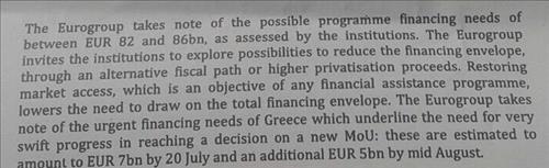 이날 스페인 일간 엘문도가 트위터에 공개한 유로그룹 성명문 초안에 따르면 그리스의 구제금융 규모를 820억~860억 유로로 추정했다.