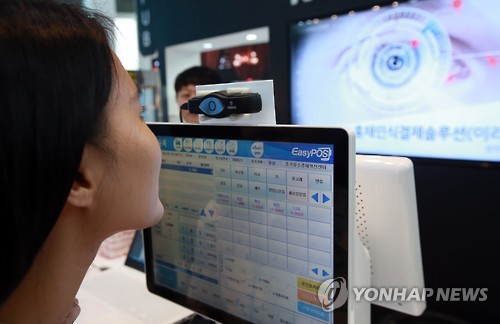 | △ 지난 5월 서울 강남구 코엑스에서 열린 '월드 IT쇼 2015' KT 부스에서 한 참가자가 홍채 인식 결제 시스템을 체험하고 있다. (연합뉴스 자료사진) |