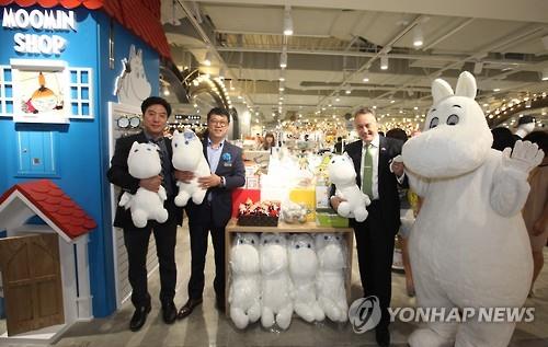| △ '롯데백화점 잠실점 영유니크관 오픈을 축하합니다' (서울=연합뉴스) 6월 30일 서울 송파구 롯데백화점 잠실점 무민샵에서 마띠 헤이모넨 주한 핀란드 대사, 롯데백화점 황규완 잠실점장 등이 매장 오픈을 축하하고 있다. 2015.6.30 |