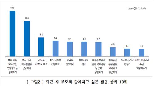 반면 자녀는 부모와 가장 하고 싶은 것으로 '블록, 퍼즐, 보드게임 등 놀이'(19.8%)를 가장 많이 꼽아 부모의 희망과는 다소 차이를 보였다.