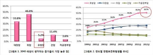조사 결과를 보면 30∼40대 여성 4명 중 1명(23.5%)이 가장 두려운 질병으로 암을 꼽았다. 발병 증가율이 가장 높은 암으로는 응답자의 46%가 위암을 지목했으며 유방암을 꼽은 응답자는 5.2%에 그쳤다.