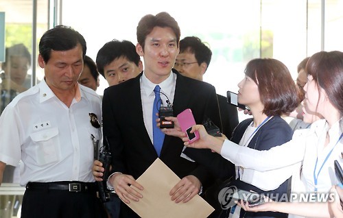 | △ 기자 질문받는 박태환 (서울=연합뉴스) 최재구 기자 = 전 국가대표 수영선수 박태환이 14일 서초구 서울중앙지법에서 열린 김모 원장의 세 번째 공판에 증인으로 출석하고 있다. 2015.7.14 jjaeck9@yna.co.kr |