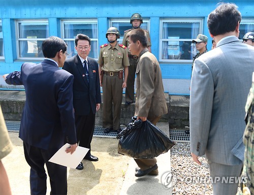 | △ 송환되는 북한 선원 (서울=연합뉴스) 지난 4일 울릉도 근해에서 구조된 북한 선원 5명 중 북측으로 돌아가기를 원하는 선원이 14일 판문점을 통해 송환되고 있다. (통일부 제공) |