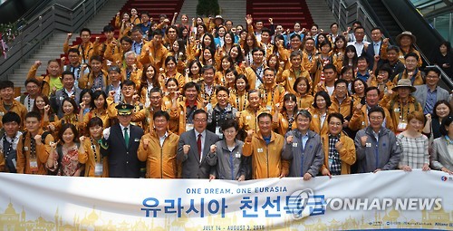 | △ 유라시아 친선특급 발대식 (서울=연합뉴스) 김도훈 기자 = 14일 오전 서울역에서 열린 유라시아 친선특급 발대식에서 최연희 코레일 사장, 조태용 외교부차관 등을 비롯한 참석자들이 기념촬영을 하고 있다. 19박 20일간 진행되는 이번 행사는 유라시아 역내 국가간 경제협력을 강화해 통일의 초석을 쌓자는 박근혜 대통령의 '유라시아 이니셔티브' 구상의 하나로 진행되며 정·재계와 학계, 문화계 인사와 대학생 등 200명이 참가한다. |