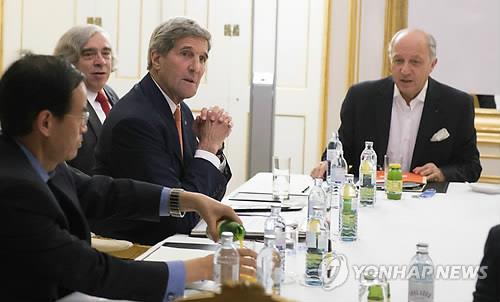 | △ (빈 AP=연합뉴스) 이란과 주요 6개국(유엔 안전보장이사회 5개 상임이사국+독일)이 14일(현지시간) 13년 만에 역사적인 이란 핵협상을 최종 타결했다. 사진은 이날 오스트리아 빈소재 팔레 코부르크 호텔 회담장에 미국의 존 케리 국무장관(왼쪽 2번째 부터)과 어니스트 모니즈 에너지장관, 로랑 파비우스 프랑스 외무장관 등이 앉아 있는 모습. |