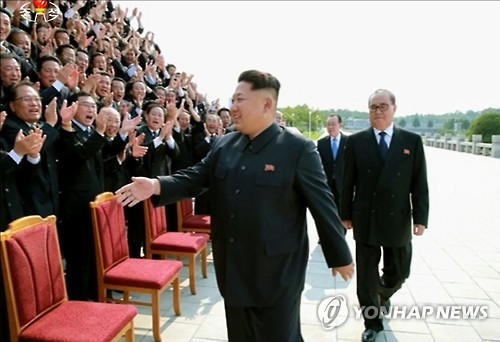 | △ 북한 김정은, 해외 주재 외교관 소집해 기념사진 촬영 (서울=연합뉴스) 김정은 국방위원회 제1위원장이 '대사회의'에 참석한 북한 외교관들과 함께 기념사진을 찍었다고 15일 조선중앙TV가 보도했다. 최근 해외 주재 북한 중간 간부들의 동요가 커지고 있는 가운데 김정은 제1위원장이 이례적으로 이들을 만나 사진을 찍으며 '군기 잡기'에 나선 것이라는 분석이 나온다. 김정은 제1위원장이 기념사진 촬영 대형으로 서있는 외교관들에게 손을 건네는 시늉을 하고 있다. |