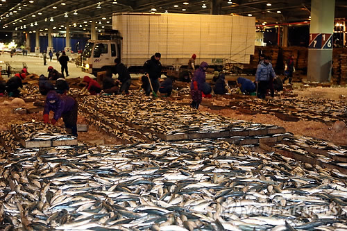 | △ 부산공동어시장 새해 첫 경매 (부산=연합뉴스) 조정호 기자 = 2일 부산시 서구 부산공동어시장에서 고등어, 꽁치, 방어 등 연근해에서 잡힌 각종 생선이 위판되고 있다. 부산공동어시장은 을미년 첫 경매인 초매식을 열었다. 2015.1.2 ccho@yna.co.kr |