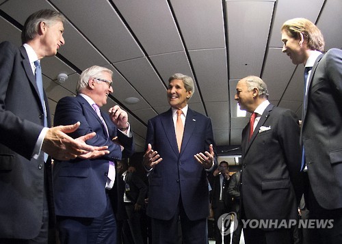 | △ 18일 간의 마라톤 협상을 통해 이란 핵 문제 타결에 성공한 영국, 독일, 미국, 프랑스, 오스트리아(왼쪽부터)의 외무장관들이 14일 오스트리아 빈 유엔 유럽본부에서 축하 인사를 나누고 있다.(연합뉴스 사진DB) |