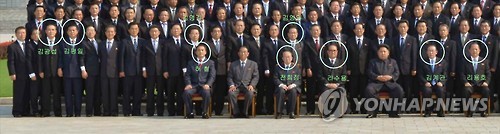 맨 앞줄 김정은 제1위원장의 양옆에는 리수용 외무상과 김계관 제1부상이 앉았고 리 외무상 곁에는 김정일 위원장의 의전을 담당했던 전희정 외무성 부상, 김계관 제1부상의 옆에는 대미외교 담당인 리용호 외무성 부상이 각각 자리했다.