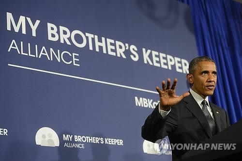 | △ '내 형제' 지켜야죠 (뉴욕 AP/더 데일리 뉴스=연합뉴스) 볼티모어 흑인청년 사망에 따른 폭동사태로 흑인 젊은이들의 열악한 교육과 빈곤에 대한 미국사회의 관심이 재부각된 가운데 버락 오바마 대통령이 '내 형제의 보호자'(My Brother's Keeper) 프로그램 강화계획을 2015년 5월4일(현지시간) 발표했다. |