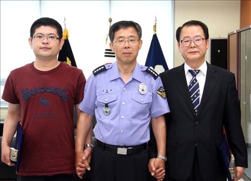 (평택=연합뉴스) 류수현 기자 = 평택해양경비안전서는 서해에서 실종됐던 '9신화호' 선원 8명을 발견하고 신고해 구조하는데 기여한 일조국제훼리 소속 리자오오리엔트호 1등 항해사 장구롱(34·중국 국적)씨와 일조국제훼리 평택지점장 안경용(52)씨에게 각각 감사장을 전달했다고 16일 밝혔다.