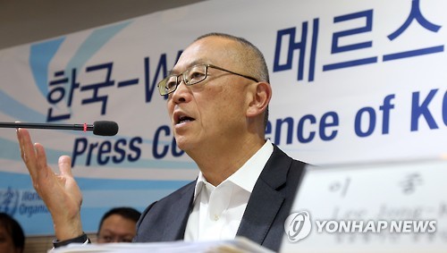 | △ 한국과 세계보건기구(WHO) 메르스 합동평가단 공동단장인 케이지 후쿠다 WHO 사무차장이 지난달 정부세종청사 보건복지부에서 열린 평가단 활동결과 기자회견에서 기자들의 질문에 답하고 있다. (연합뉴스 자료사진) |