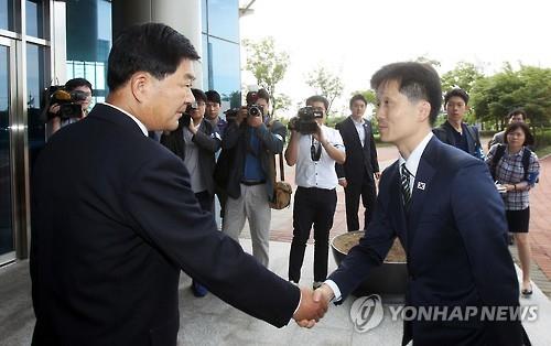 북한 근로자 임금 인상 문제 등을 논의할 개성공단 남북공동위원회 제6차 전체회의가 오늘 오전 10시 개성공단에서 시작됐다. 남북이 2013년 8월 '개성공단 정상화를 위한 합의서'를 채택하면서 출범한 당국 간 채널인 개성공단 남북공동위는 작년 6월 5차 회의 이후 열리지 못하다가 이번에 1년1개월 만에 개최됐다. 이상민 통일부 남북협력지구발전기획단장 등 남측 대표단 5명이 공동취재단과 함께 회담이 열리는 개성공단 종합지원센터에 도착하자 박철수 중앙특구개발지도총국 부총국장 등 북측 대표단이 맞이했다.이 단장은 가볍게 웃는 표정으로 "반갑습니다"라며 북측 대표단과 악수를 했다. 북측 대표인 박 부총국장은 악수할 때 살짝 미소를 머금었지만, 전반적으로 무표정했다.