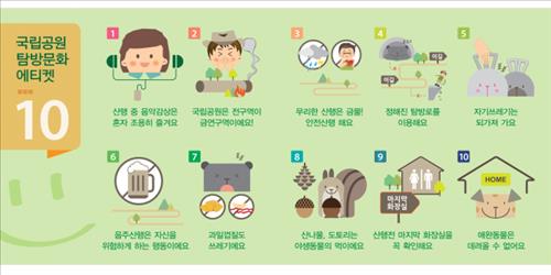 공단은 ▲ 산행 중 음악감상은 혼자 조용히 즐기기 ▲ 음주 산행 및 흡연 금지 ▲ 정해진 탐방로 이용 ▲ 산나물·도토리는 야생동물의 먹이 ▲ 자기 쓰레기 되가져 가기 등 국립공원 탐방 예절을 지켜달라고 당부했다.