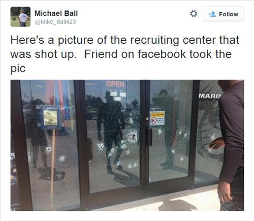 | △ 미국 테네시 주 채터누가의 해군 지원 사무소에서 16일 오전(현지시간) 총격 사건이 발생해 경관 1명과 해병 4명 포함 5명이 총에 맞고 쓰러졌다. 경찰은 현재 용의자를 추적하고 있다. 트위터 사진은 해군 지원 사무소 출입문에 박힌 총격 흔적이다. |