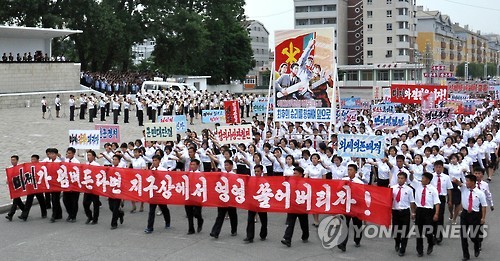 | △ 북한 '반미투쟁' 군중대회 (평양 조선중앙통신=연합뉴스) 25일 북한 각 지역에서 '6·25 미제 반대 투쟁의 날' 군중대회가 열리고 있다. 조선중앙통신은 이 사진을 보도하며 정확한 촬영장소를 밝히지 않았다. 2015.6.26 photo@yna.co.kr |