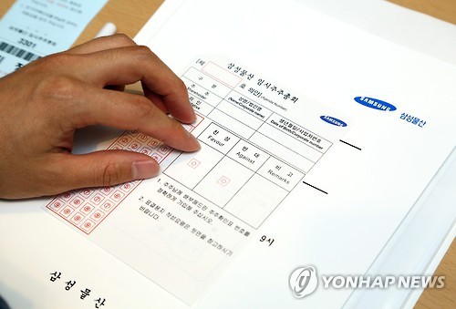 | △ 삼성물산 주총…'합병안 표결은?' (서울=연합뉴스) 17일 오전 서울 양재동 aT센터에서 열린 제일모직과의 합병계약 안건을 주주 결의에 부치는 임시 주주총회의에서 한 주주가 표결용지를 들고 있다.(삼성물산 제공) |
