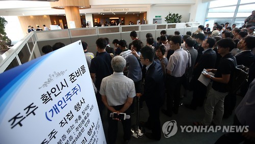 | △ 삼성물산 임시 주주총회 (서울=연합뉴스) 박동주 기자 = 17일 오전 서울 양재동 aT센터에서 열린 삼성물산과 제일모직의 합병계약 안건을 주주 결의에 부치는 임시 주주총회에 앞서 주주들이 주주확인을 받고 있다. |