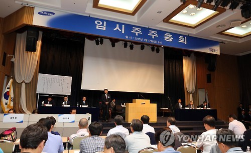 (서울=연합뉴스) 옥철 박대한 기자 = 삼성물산[000830]은 17일 서울 양재동 aT센터에서 열린 임시 주주총회에서 이익을 배당할 때 보유주식 등 현물로 배당할 수 있도록 하는 내용의 정관 일부 변경안이 부결됐다고 밝혔다.