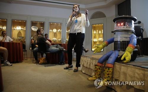| △ 16일 메사추세츠 주 세일럼의 피보디 에섹스 박물관에서 공동 개발자인 프라우케 젤러 교수가 히치봇을 소개하고 있다. (AP=연합뉴스) |