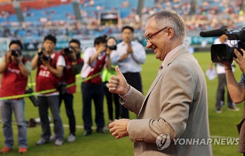 | △ '잘 해보자고!' (안산=연합뉴스) 신준희 기자 = 17일 경기도 안산 와스타디움에서 열린 프로축구 K리그 올스타전 팀 슈틸리케와 팀 최강희의 경기. 슈틸리케 감독이 선수들을 맞이하고 있다. 2015.7.17 hama@yna.co.kr |