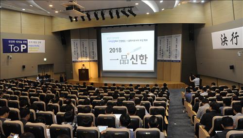 (서울=연합뉴스) 고동욱 기자 = 신한생명은 17∼18일 천안 연수원에서 임직원 260여 명이 참석한 전략회의를 열고 올 하반기 슬로건으로 'ToP3(티오피 쓰리)'를 채택했다고 밝혔다.