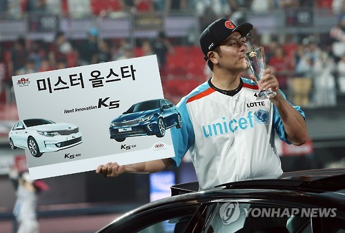 | △ '별중의 별' 강민호 (수원=연합뉴스) 김주성 기자 = 18일 오후 수원 케이티 위즈 파크에서 열린 2015 타이어뱅크 KBO리그 올스타전 드림팀 대 나눔팀 경기. 최우수선수(MVP)상인 '미스터 올스타'로 뽑힌 드림올스타팀의 강민호(롯데)가 부상으로 받은 신형 K5에 올라 포즈를 취하고 있다. 2015.7.18 utzza@yna.co.kr |
