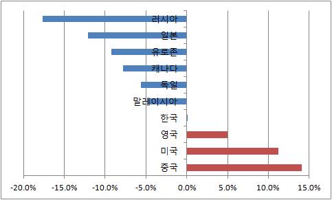 주요 국가 가운데 러시아(-17.6%), 브라질(-15.9%)의 절하율이 컸고, 양적완화를 시행하고 있는 일본(-12.1%), 유로존(-9.2%)도 통화가치가 크게 떨어졌다.