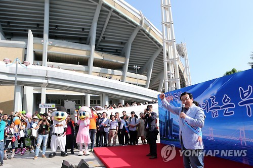 | △ (부산=연합뉴스) 조정호 기자 = 서병수 부산시장이 28일 오후 사직야구장에서 열린 '메르스 위기 극복 범시민 경제살리기 대회'에 참석, '올 여름에 부산으로 와달라'고 호소하고 있다. 2015.6.28 ccho@yna.co.kr |