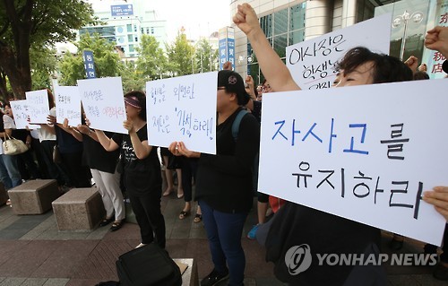 | △ 3일 오후 서울 광화문 동화면세점 앞에서 열린 '미림여고 자사고 유지 촉구를 위한 학부모 기자회견'에서 학부모들이 일반고 전환 반대 등의 구호를 외치고 있다. (연합뉴스 자료사진) |
