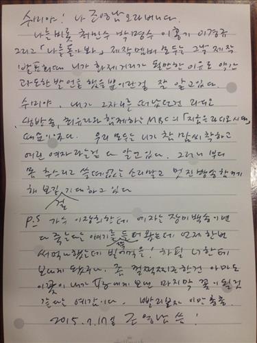 "수미야, 나 조영남 오라버니다"로 시작하는 손편지에서 조영남은 "그날 제작발표회 때 네가 화젯거리가 될 많나 이유로 약간 과도한 발언을 했을 뿐이란 걸 잘 알고 있다"며 "우리 모두는 네가 참 맘씨 착하고 여린 여자라는 걸 다 알고 있다. 그러니 부디 몸 추스르고 쓸데없는 소리 말고 멋진 방송 함께 해보길 거듭 기대하고 있다"고 적었다.