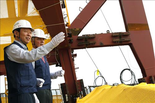 | △ 롯데그룹 신동빈 회장(왼쪽)이 20일 오후 영국 상원으로 활동중인 휴 트렌차드 자작(Hugh Trenchard, 3rd Viscount Trenchard)과 롯데월드타워 103층 공사현장을 둘러보고 있다. |