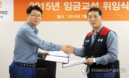 | △ 한화케미칼 울산노조, 사측에 임금교섭 위임 (울산=연합뉴스) 한화케미칼은 울산공장 노동조합이 올해 임금교섭에 관한 모든 사항을 사측에 위임했다고 21일 밝혔다. 지난 20일 한화케미칼 울산공장에서 열린 '임금교섭 위임식'에서 류재규 공장장과 최규헌 노조위원장이 악수하고 있다. 2015.7.21 << 한화케미칼 제공 >> canto@yna.co.kr |