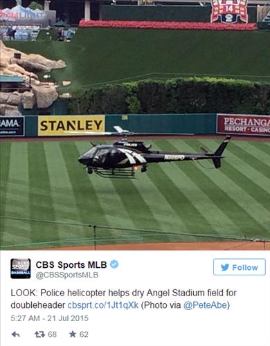 21일(한국시간) AP통신은 에인절 스타디움 관리팀이 전날 많은 비로 인해 흠뻑 젖은 외야를 말리기 위해 경찰 헬리콥터를 동원했다고 보도했다.