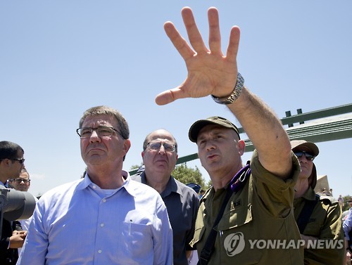 AP·블룸버그통신 등에 따르면 이스라엘을 방문 중인 애슈턴 카터 미국 국방장관은 20일(현지시간) 모세 야알론 이스라엘 국방장관과 함께 레바논 국경에 있는 산꼭대기 전망대에 올랐다.