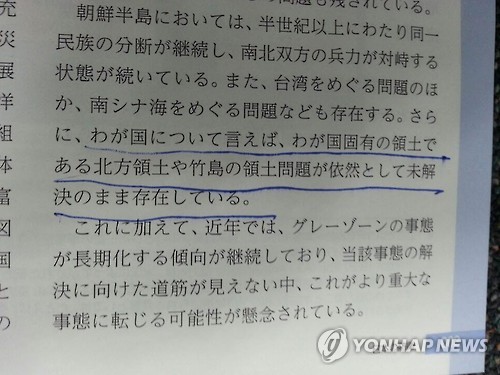 | △ 올해 日방위백서의 독도 관련 기술 (도쿄=연합뉴스) 조준형 특파원 = 21일 확정된 올해 일본 방위백서의 독도 관련 기술. "우리나라 고유 영토인 북방영토(쿠릴 4개섬의 일본식 표현)나 다케시마(竹島·일본이 주장하는 독도의 명칭)의 영토문제가 여전히 미해결된 채로 존재하고 있다"는 표현이 담겼다. |