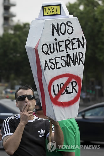 | △ 지난 6월11일 한 남성이 스페인 마드리드에서 우버의 불공정 경쟁에 항의하는 시위를 벌이는 모습(연합뉴스 사진DB) FILE - In this June 11, 2014 file photo, a demonstrator carries a mock coffin with a message reading 'They want to kill us - Uber' during a 24 hour taxi strike and protest in Madrid, Spain against unregulated competition from private companies, in particular, Uber. A judge has ordered the precautionary suspension of the ridesharing service Uber in Spain on Tuesday Dec. 9, 2014, saying it represents unfair competition. The suspension had been sought by Madrid’s Taxi Association, which is planning a legal case against Uber which allows passengers to hail a ride from a mobile app. The company takes a cut from what the drivers charge. Taxi drivers say such services are unfair as the drivers do not have to fulfill the same requirements or pay tens of thousands of euros (dollars) for training and licences as taxi drivers do. The San Francisco-based company has met with opposition in other European Union countries. (AP Photo/Paul White, File) |
