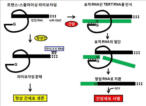 연구팀은 "우리가 개발한 '마이크로 RNA 조절 트랜스-스플라이싱 라이보자임'은 발암 유전자 중 하나인 '텔로머라제 역전사효소(TERT RNA)'만 인식해 이를 항암 기능을 가진 RNA로 변환한다"고 전했다.