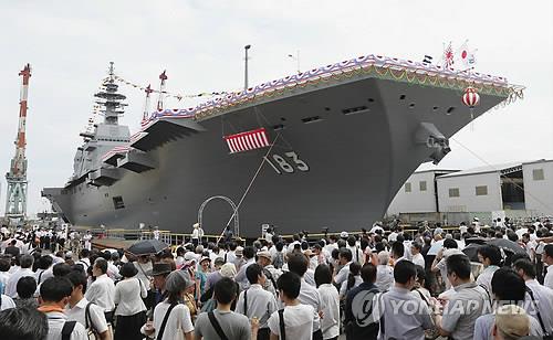 | △ 일본이 재작년 8월 요코하마(橫浜)에서 진수식을 갖고 공개한 항공모함급 헬기 호위함인 '이즈모 함'. 이즈모 함은 길이 248m, 폭 38m, 최대 배수량 2만7천t(기준배수량 1만9천500t) 규모로, 대잠 헬기 14대를 탑재할 수 있다.(교도.연합뉴스.자료사진) |