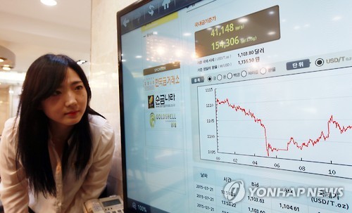 | △ 국제 금값 하락세 (서울=연합뉴스) 박동주 기자 = 금 가격이 하락을 거듭하는 가운데 21일 오후 서울 종로구 한국금거래소에서 직원이 금시세 상황 그래프를 보고 있다. 뉴욕 상품거래소(COMEX)에서 20일(현지시간) 거래의 중심인 8월물 가격은 지난 주말보다 25.1달러가 내린 온스당 1106.8달러에 거래를 마쳤다. |