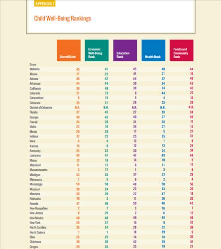 미네소타 주는 전통적으로 어린이들의 삶의 질 지수가 높은 뉴햄프셔, 매사추세츠, 버몬트 등 동부 뉴잉글랜드 지역의 주를 제치고 아동의 웰빙 지수가 가장 높은 주로, 미시시피 주와 뉴멕시코 주는 아이들이 곤궁한 삶을 사는 주로 뽑혔다.