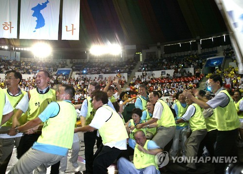 | △ 정부, 8.15 남북공동행사 민간 사전접촉 승인 (서울=연합뉴스) 정부가 22일 광복 70주년 8·15 남북공동행사 개최를 논의하기 위한 남북 민간단체의 사전접촉을 승인했다. 8·15 남북공동행사가 성사되면 2005년 서울에서 열린 이후 10년 만에 8·15 공동행사가 개최되게 된다 광복 60주년인 2005년 8월15일 서울 장충체육관에서 6.15공동선언실천을위한 남북해외공동행사 준비위 주최로 열린 체육오락경기에 참가한 선수들이 줄다리기를 하고 있다. (연합뉴스 자료사진) |