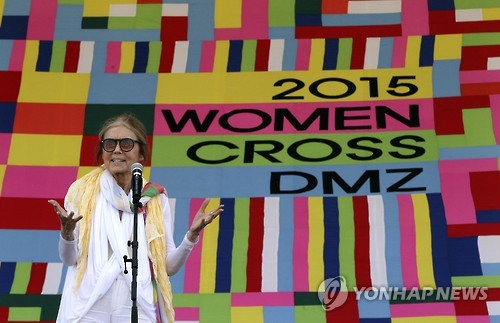| △ U.S. activist Gloria Steinem speaks during the welcoming ceremony for Women Cross DMZ, Demilitarized Zone, activists at Imjingak Pavilion near the border village of Panmunjom, in Paju, South Korea, Sunday, May 24, 2015. International women activists including Steinem and two Nobel Peace laureates on Sunday were denied an attempt to walk across the Demilitarized Zone dividing North and South Korea, but were allowed to cross by bus and complete what one of them called a landmark peace event. (AP Photo/Ahn Young-joon) |
