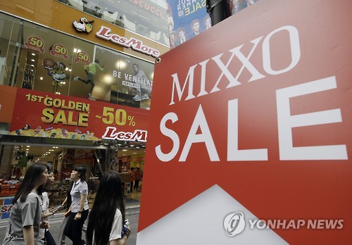 | △ People walk past sale signs at a Seoul shopping district, South Korea, Thursday, July 23, 2015. South Korea's quarterly growth slowed to the lowest in more than two years as a severe drought hit agriculture and an outbreak of Middle East respiratory syndrome sapped consumption.(AP Photo/Ahn Young-joon) |
